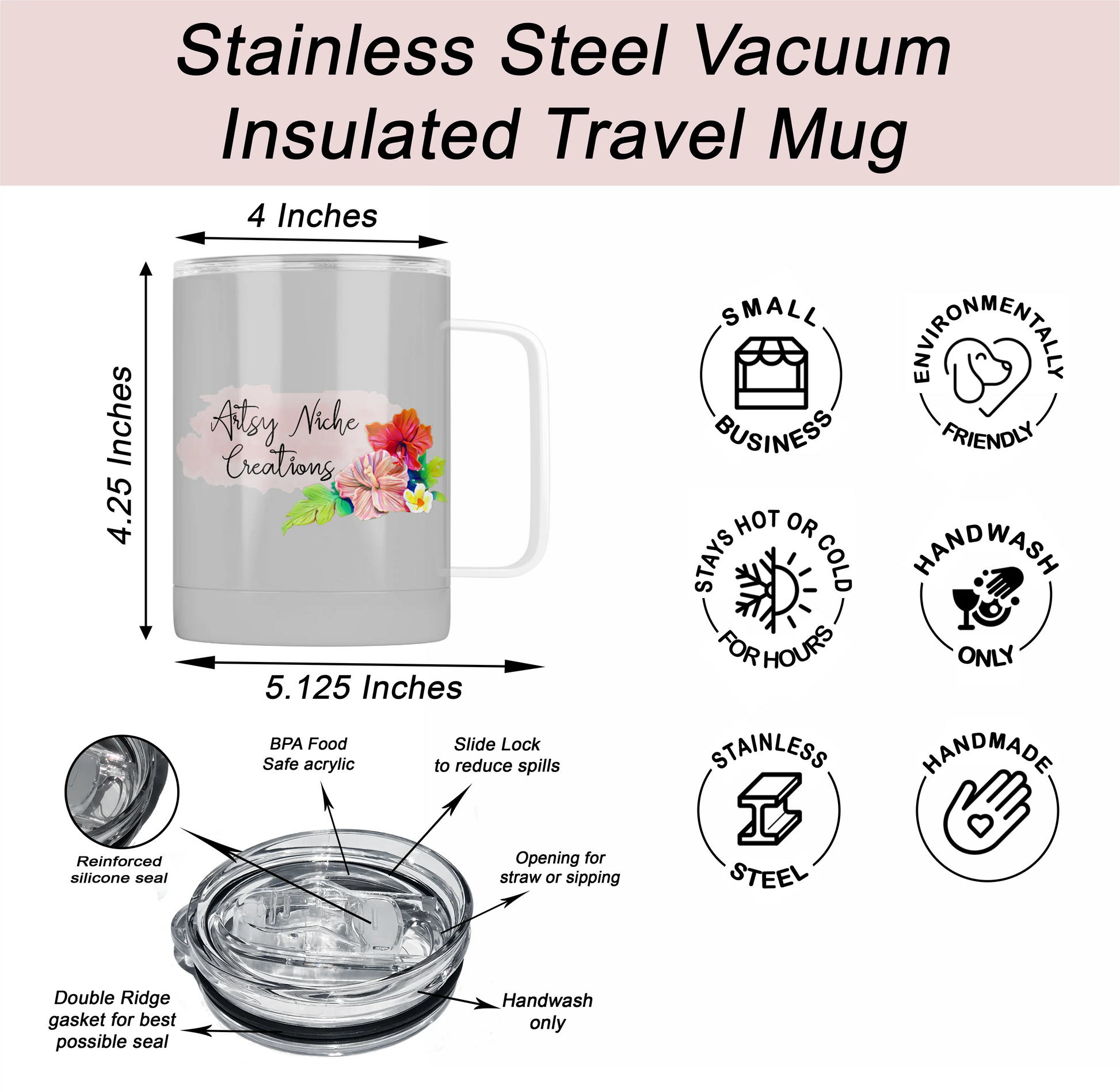 - Double-wall stainless steel mug.