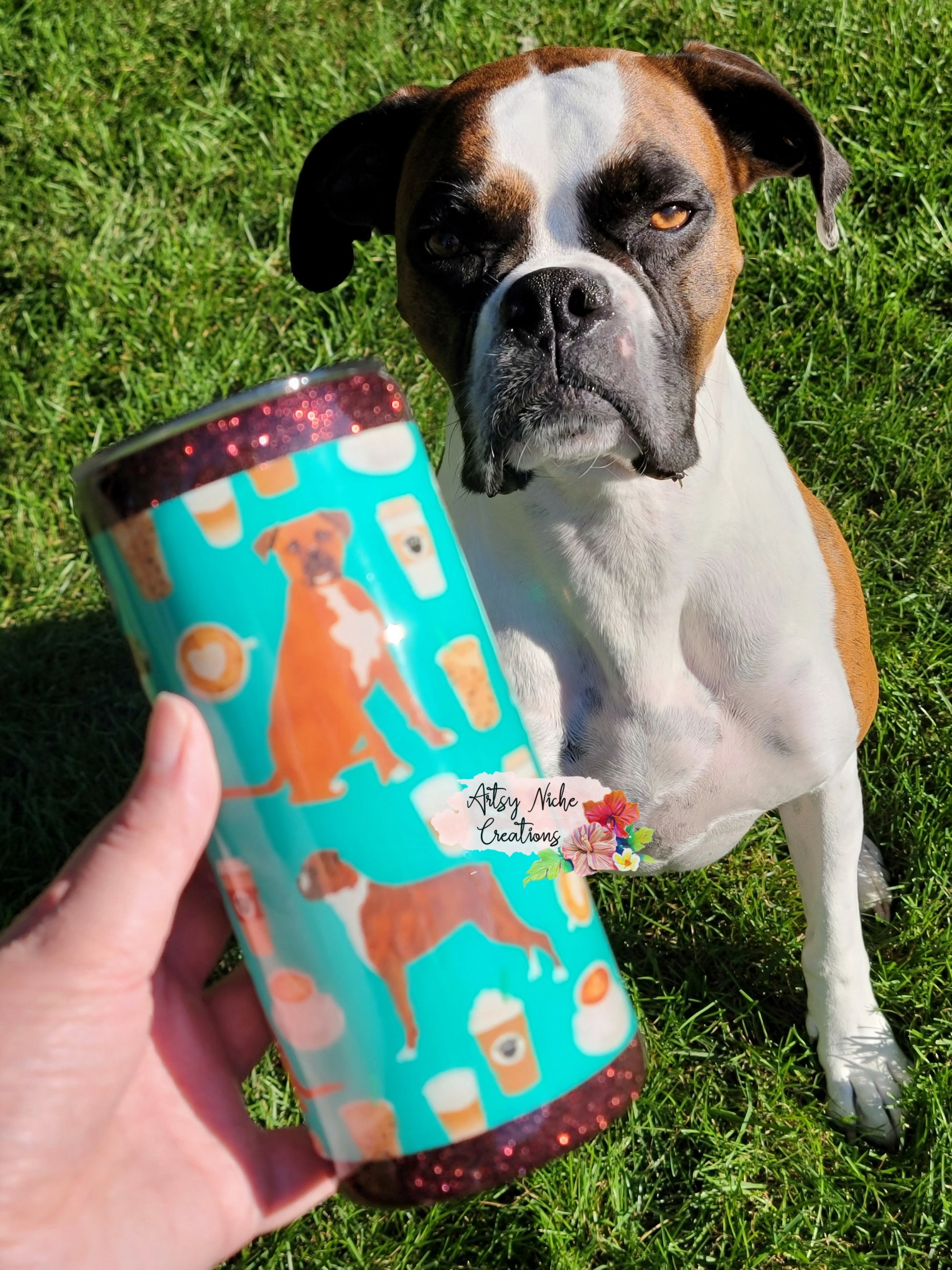 Don't let your drink ever go to the dogs! This 15 oz Boxer Dog Coffee Print Epoxy Tumbler will keep your coffee, tea, or whatever else you're sippin' on, safe and sound. It's styled with a super cute boxer print and a glossy epoxy finish, so you can have your pup and drink it too! Woof!