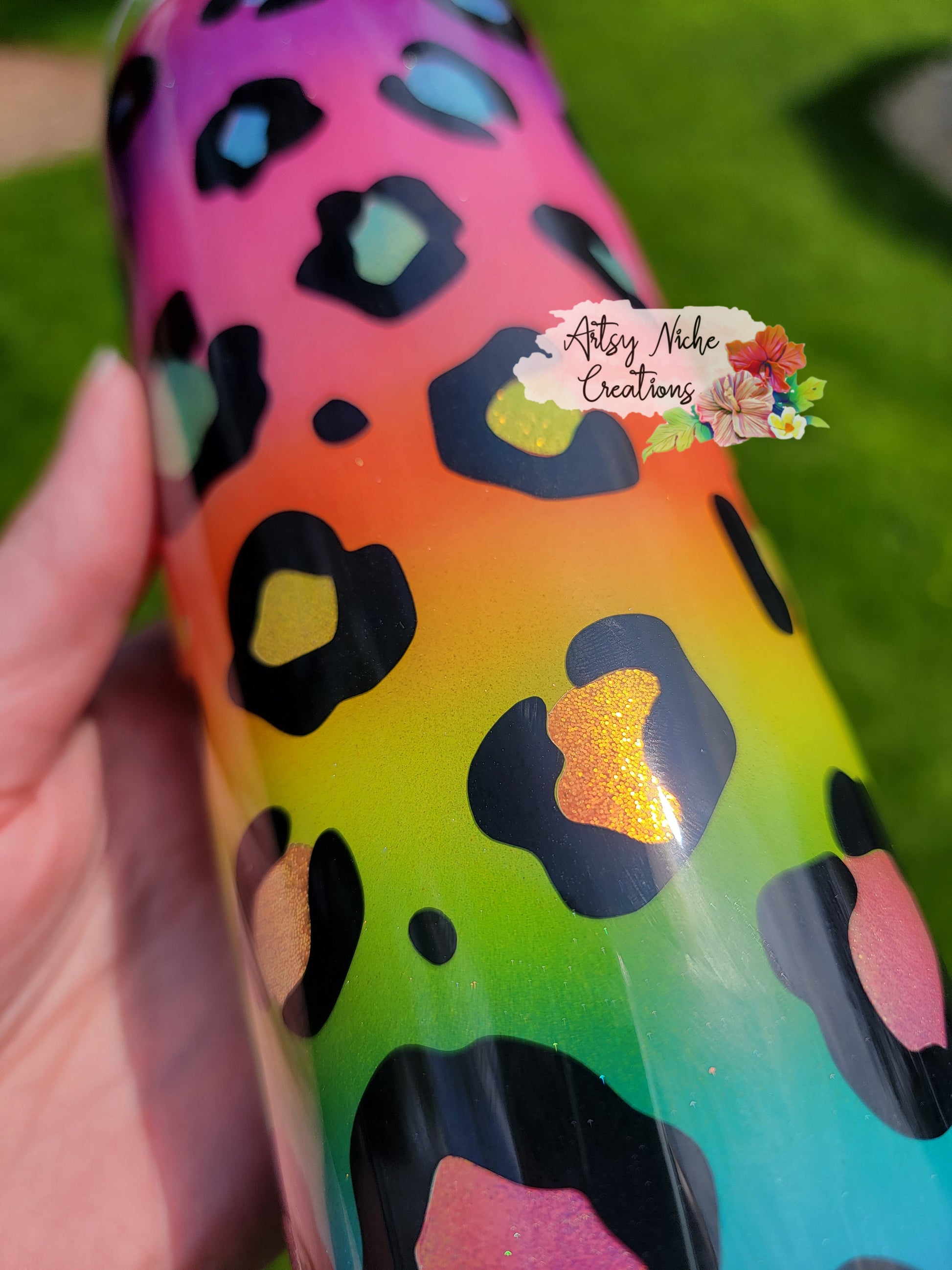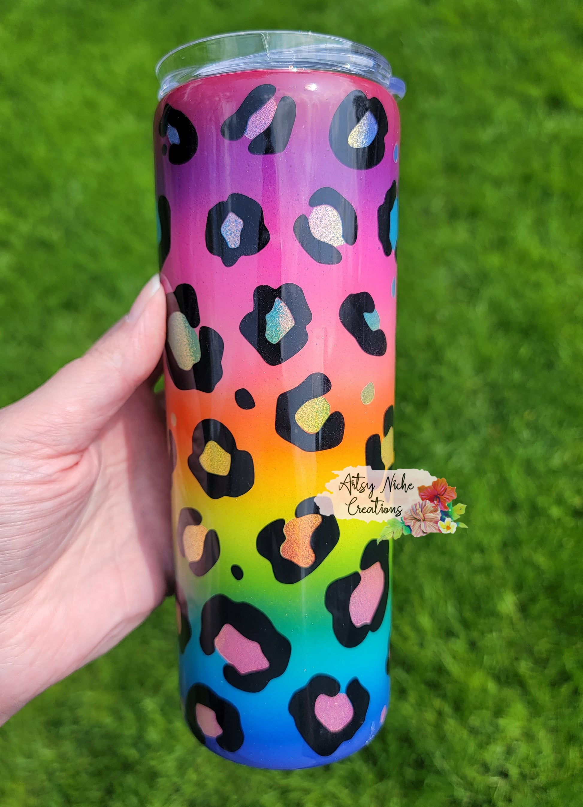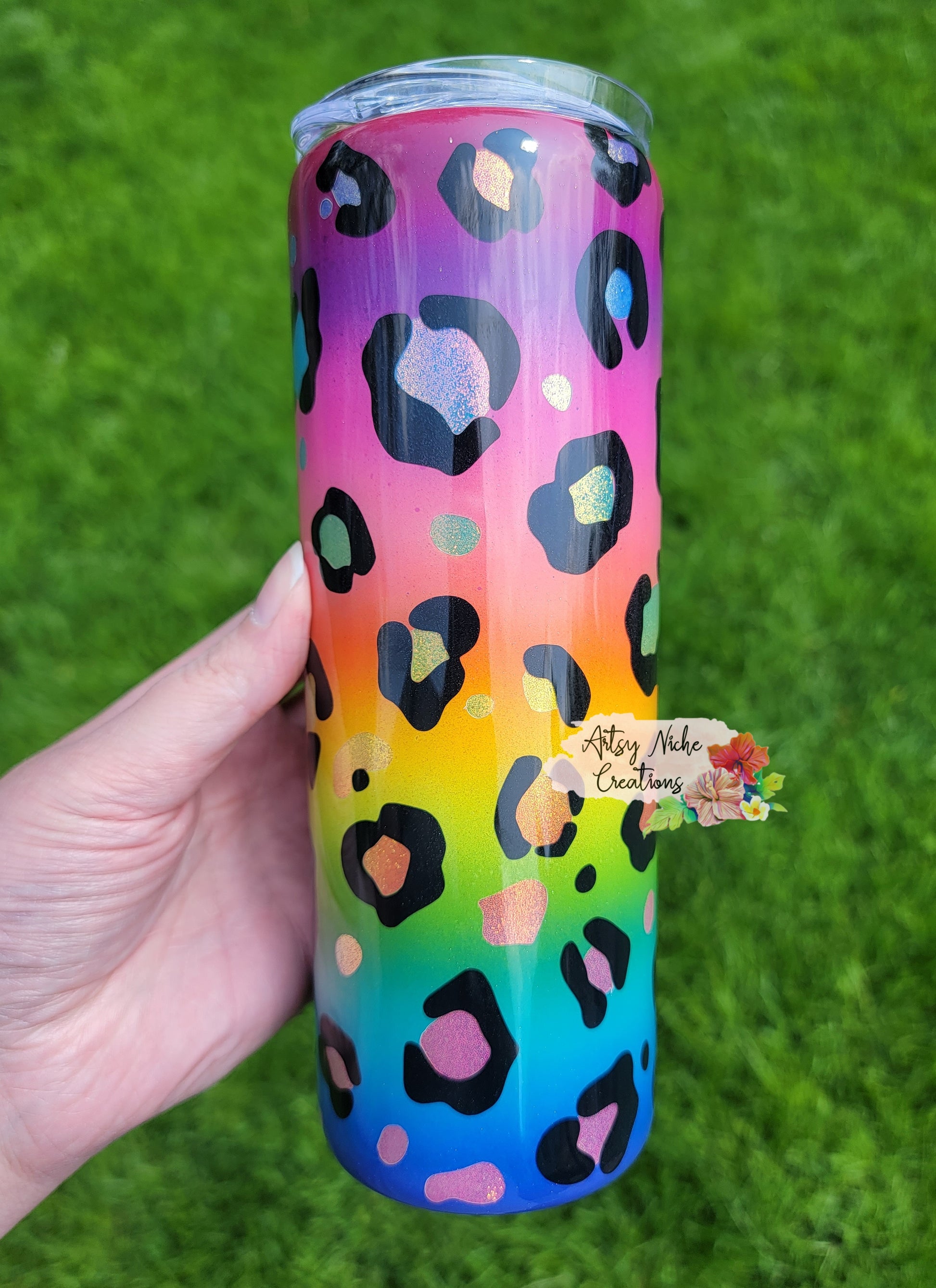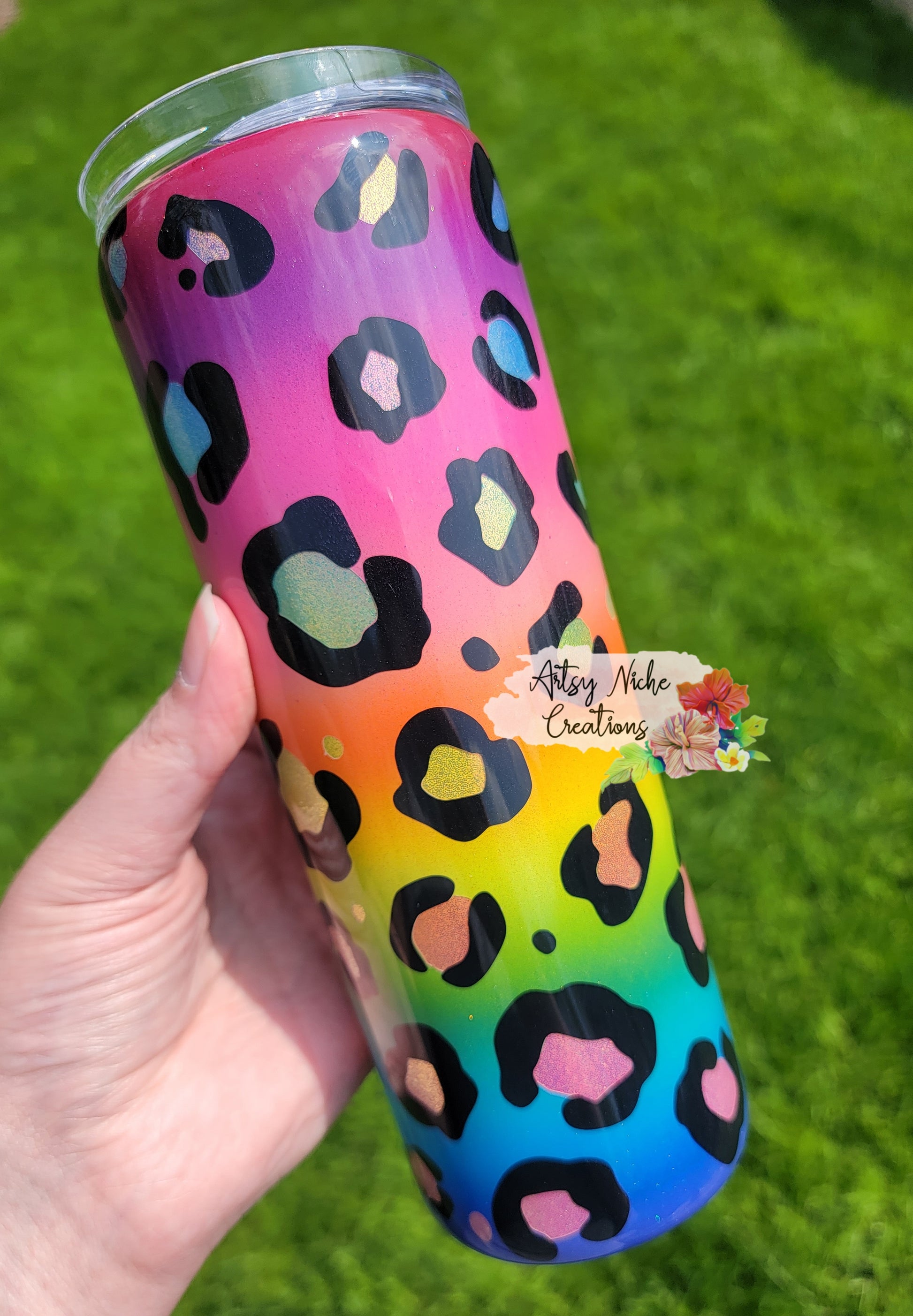 Lisa Frank Inspired, take your beverages on an exciting wild ride with this 20 oz airbrush peekaboo rainbow leopard epoxy tumbler! Guaranteed not to fall behind with its gleaming epoxy coating, it won't be too hard to spot out of the crowd with its bold rainbow leopard design. Party like a wildcat with this thirst-quenching tumbler!