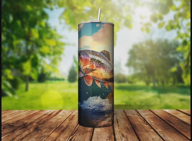 Catch a big one with this 20 oz Fishing Jumping Trout Sunset Sublimation Tumbler! Whether you’re an amateur or pro angler, this tumbler will keep your drinks icy cold (or piping hot) as you land your next big catch. Reel in the perfect combination - hunting, fishing, and hydration - with this trusty and stylish tumbler!