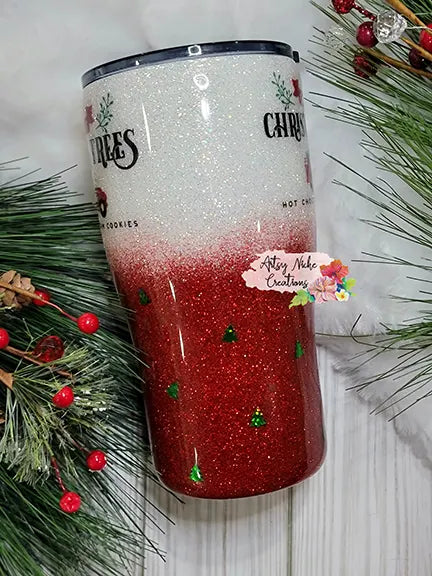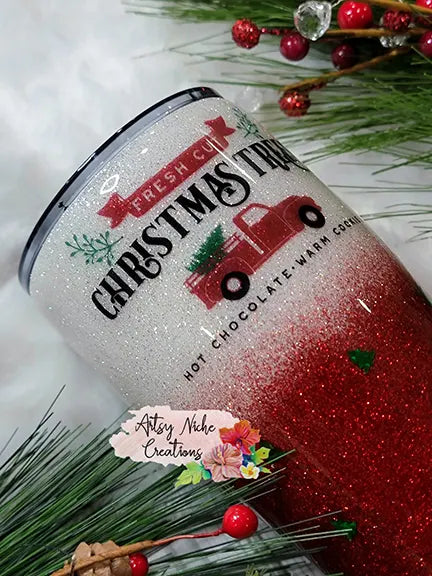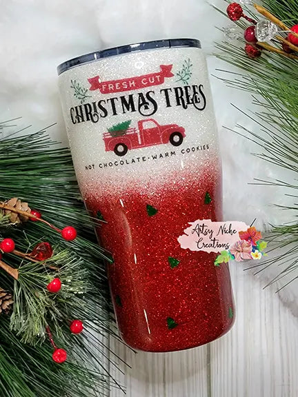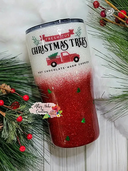 I created this beautiful red glitter to white pearlecent glitter ombre blends right into a duel sided Christmas Tree Red Truck waterslide images. Holographic trees added sporadically for a extra touch 🛻🌲
