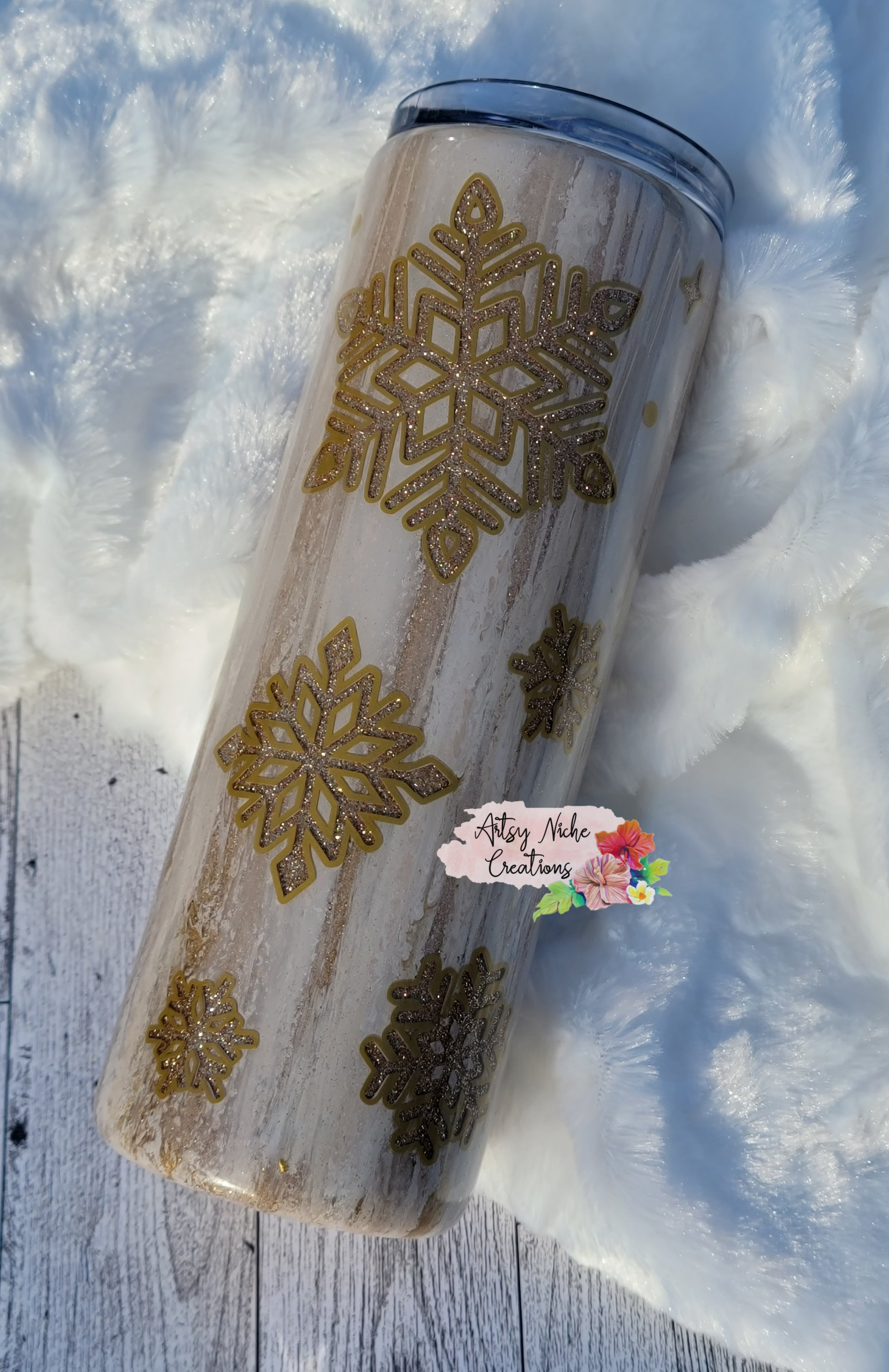 @artsynichecreations Snowflake Gold & Silver Tumblers ❄️ #wintervibes #shopify #snowflakepeekaboo #tumblersoftiktok #20oztumbler #dirtypourtumbler #launchfriday #snowday ♬ Glitter - Mae Valley