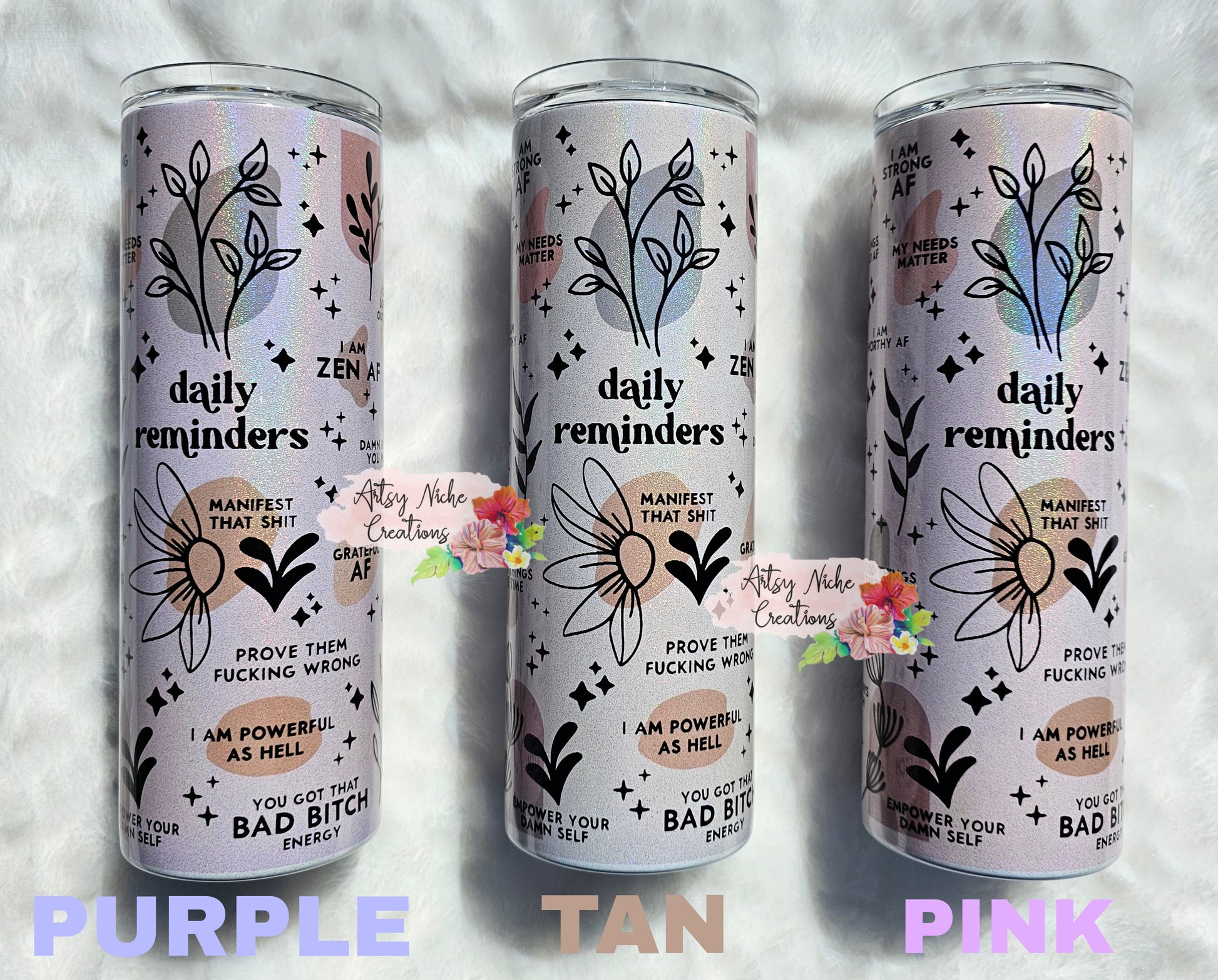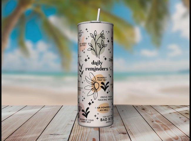 This 20 oz Holographic Daily Reminders Sublimation Tumbler combines beauty with practicality, perfect for your daily routine. Its daily reminders feature is designed to help keep you organized and on track with your responsibilities and goals. Get ready to enjoy the enduring quality and reliable design of this tumbler.