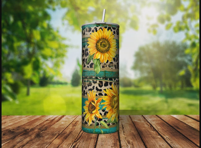 20 oz Pearlescent Rustic Wood Sunflower Leopard Print Sublimation Tumbler