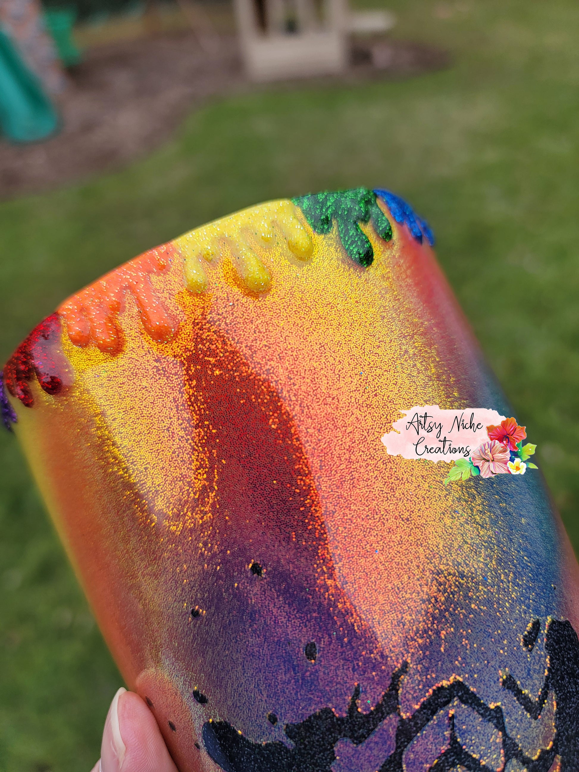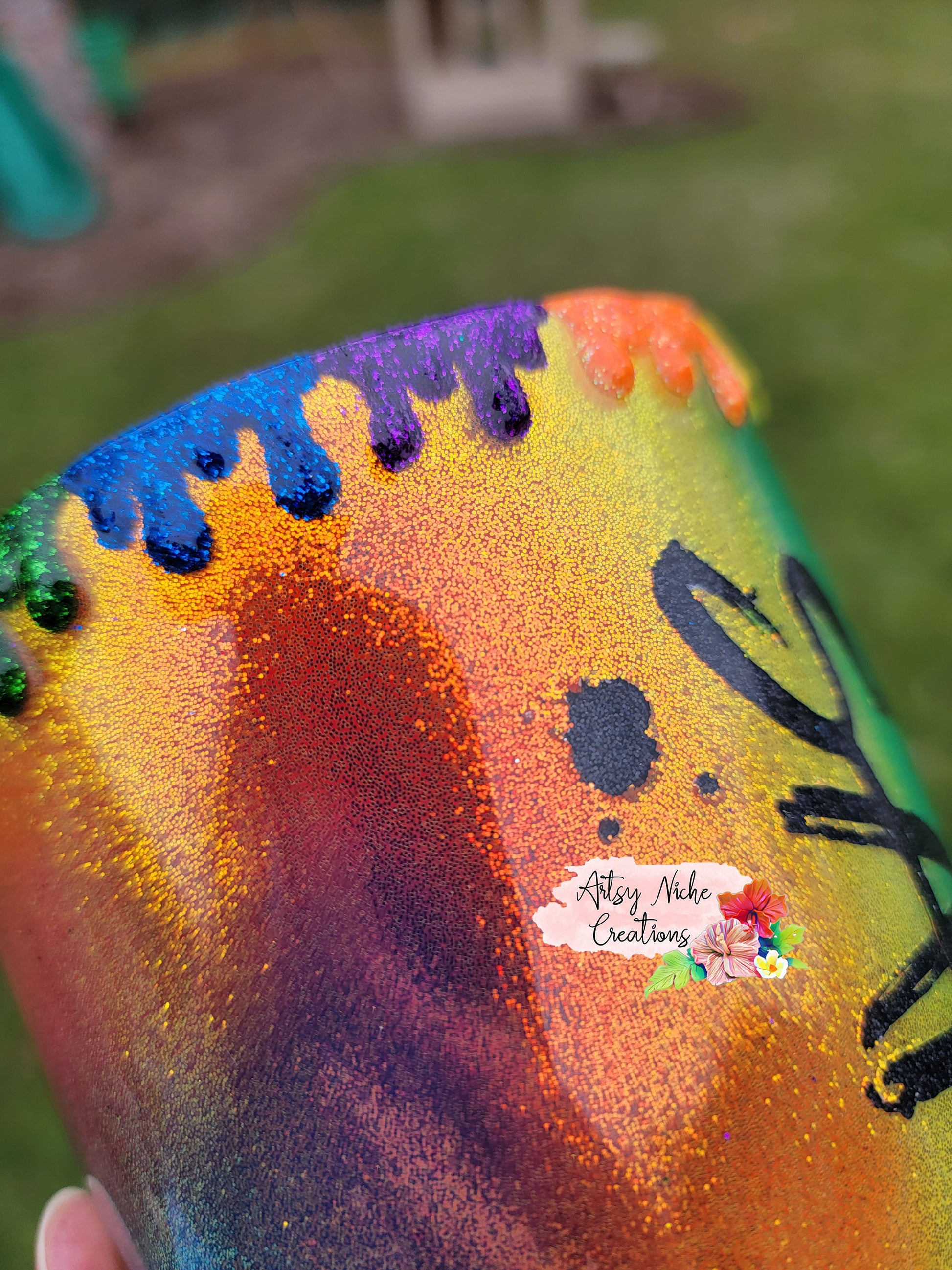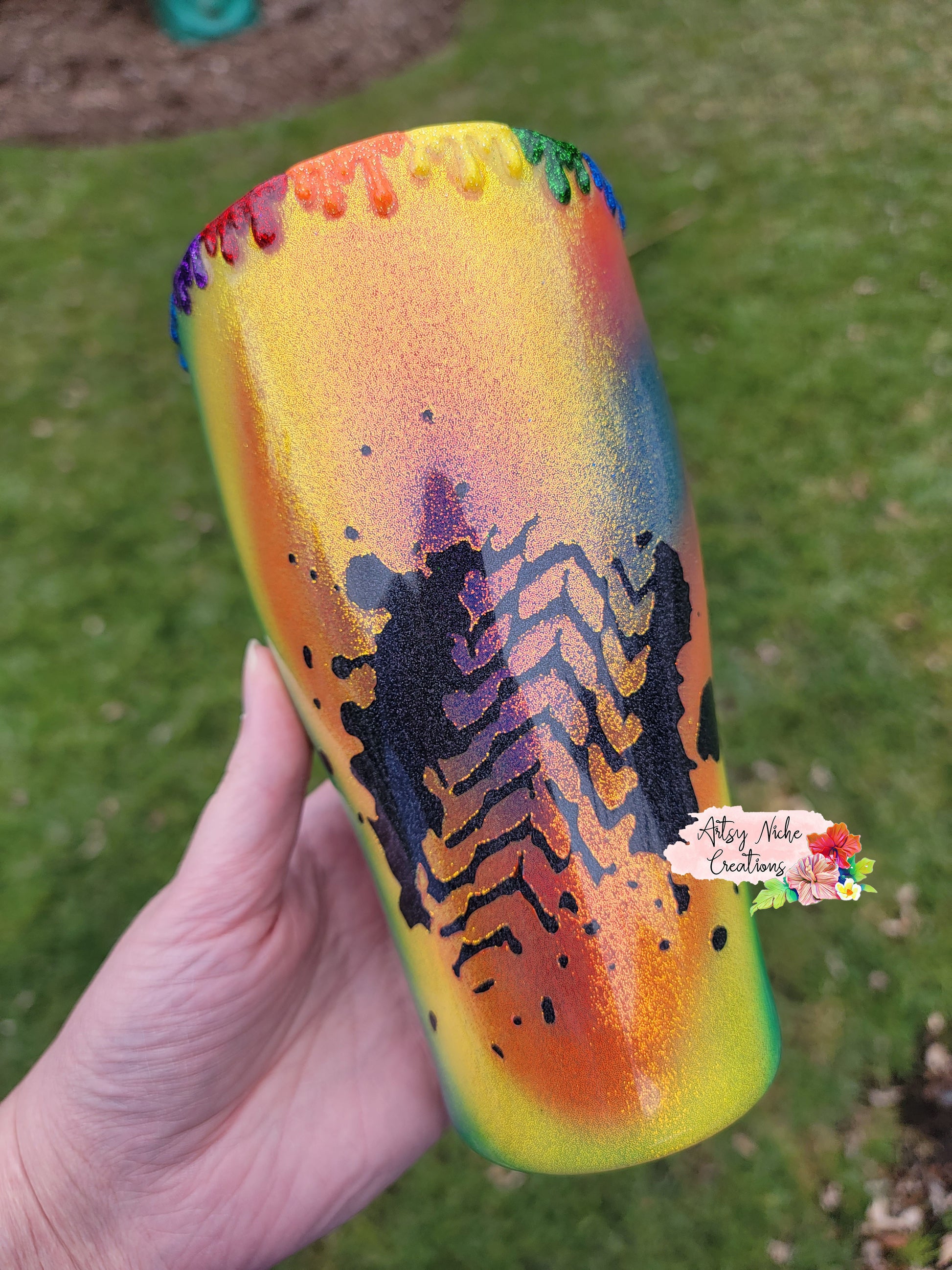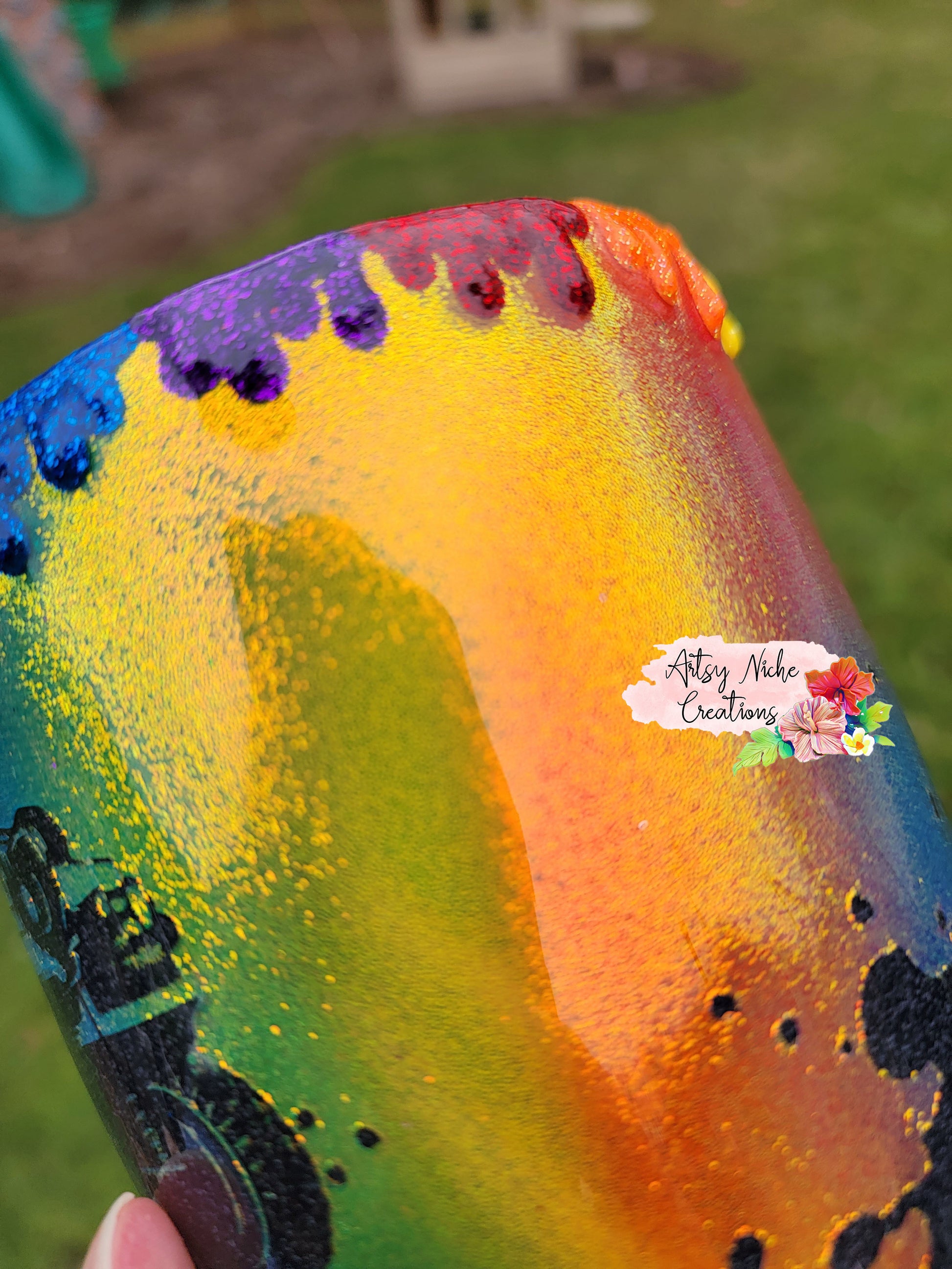 The process of making epoxy tumblers is a very lengthy process. Typical turn-around for a epoxy tumbler is approximately 4-5 weeks. We do not list epoxy tumblers until they are ready to ship. The process for producing epoxy tumblers, includes, spray painting a white base coat, glitter if applicable, decals or waterslides, colored spray paint, and a layer of epoxy. At that point, additional options are done, including but not limited to airbrushing and peekaboos. Finally, additional layers of epoxy are applied. Sanding is done in between each layer, after each layer has cured, until a glass like finish is attained.