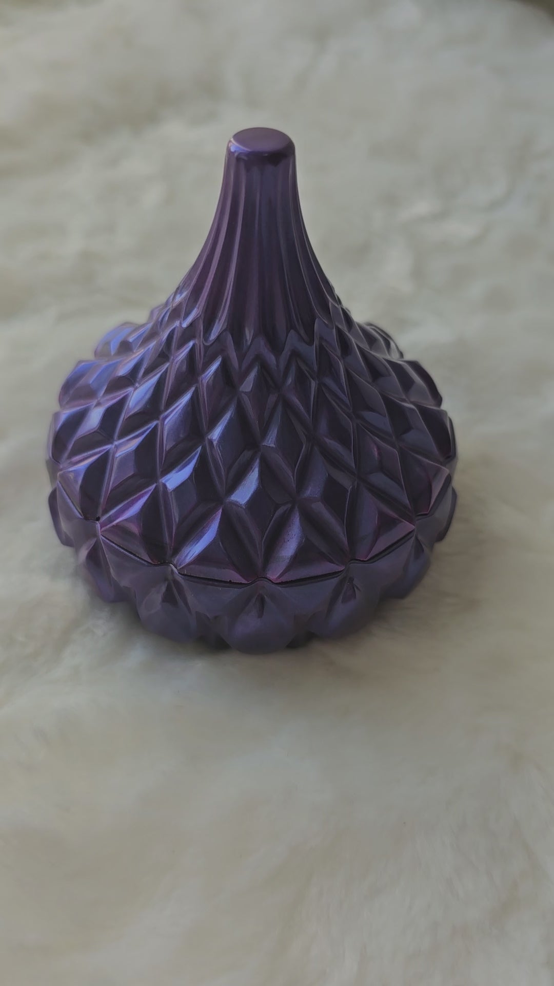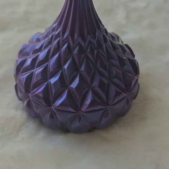 A stunning handcrafted jewelry jar that merges artistry with function. This sophisticated piece features a mesmerizing purple and black color-shift design, creating a captivating teardrop diamond pattern that shifts beautifully in different light. Crafted from epoxy resin with meticulous attention to detail, it is the perfect size for storing delicate jewelry, trinkets, or treasured keepsakes. Each piece is individually handmade, making it truly one-of-a-kind. Minor variations in color and finish are natural characteristics that celebrate the artisanal process. Spot clean only to preserve the resin's lustrous finish. An elegant addition to any vanity, dresser, or shelf—where practical storage becomes a work of art.