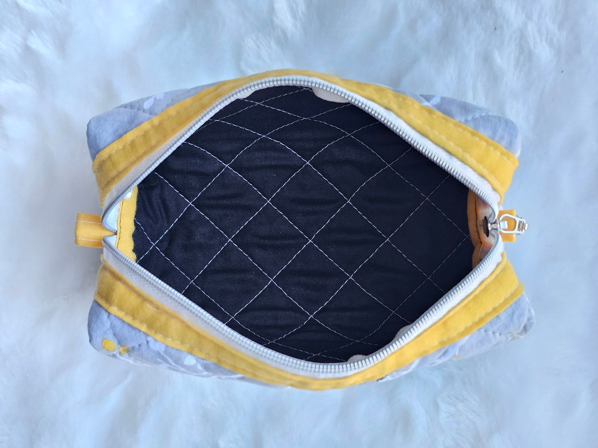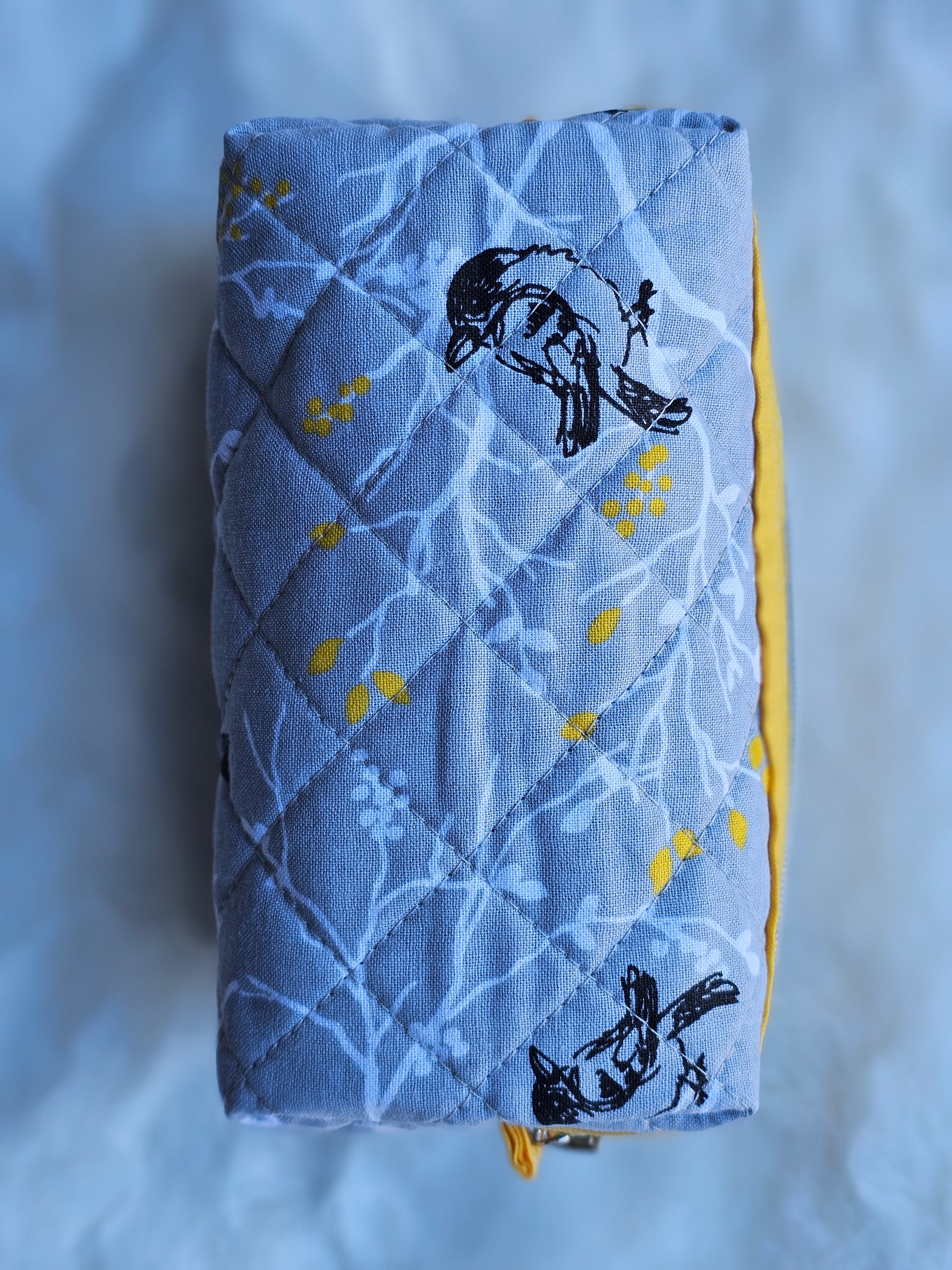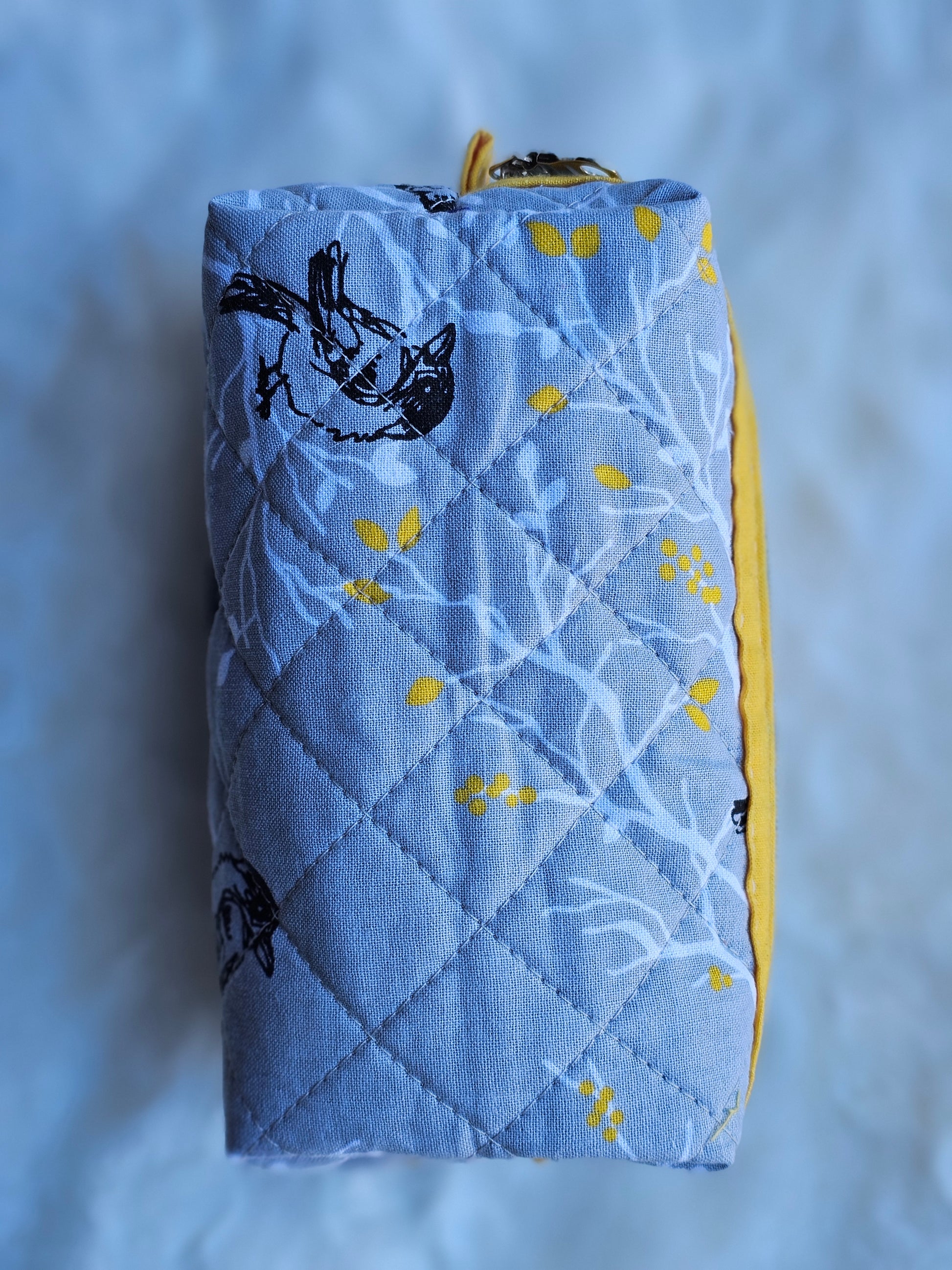 Grey Branch Sparrow Bird Pattern Yellow Accented Quilted Pattern Mini Zipper Box Pouch
