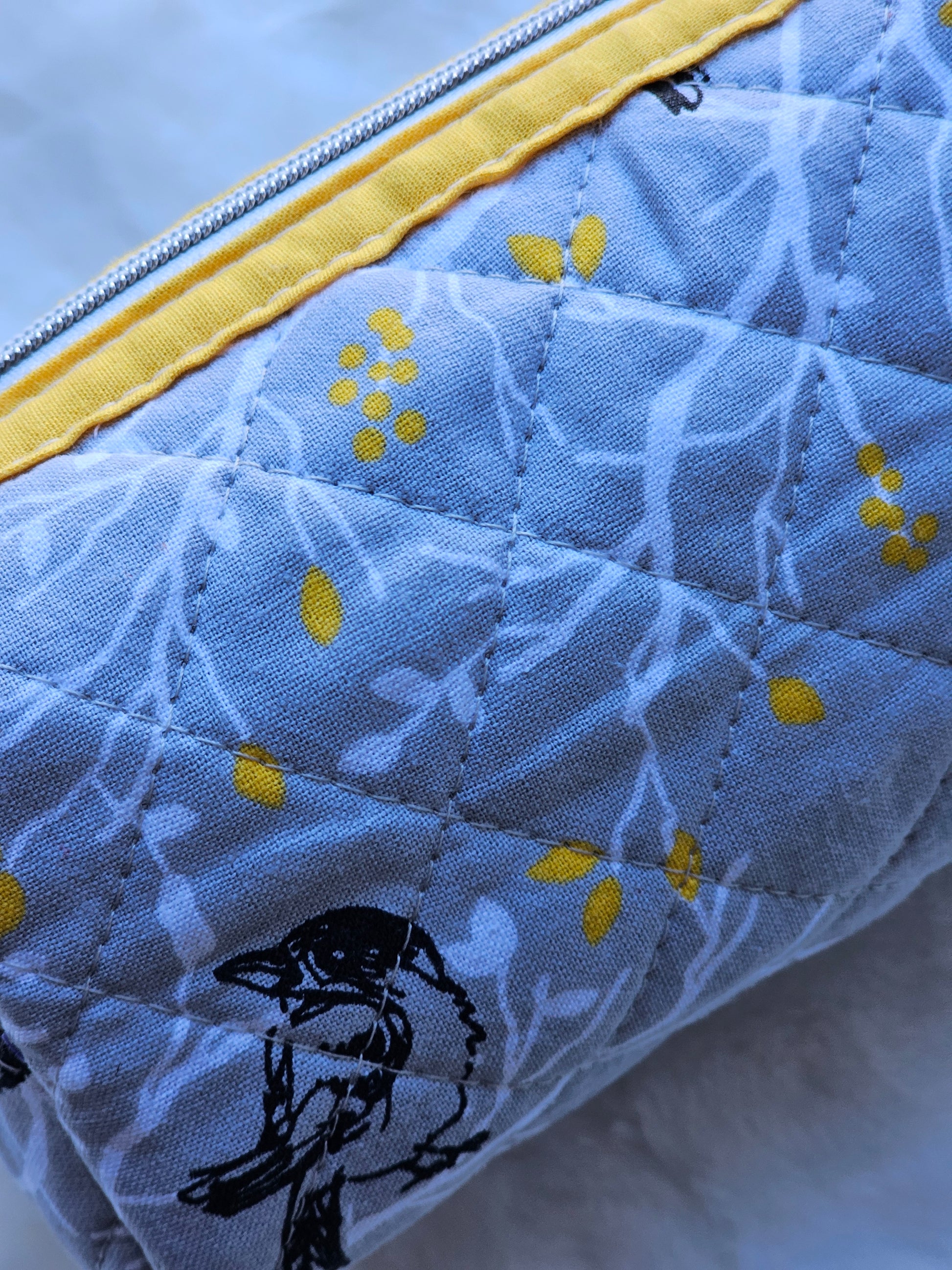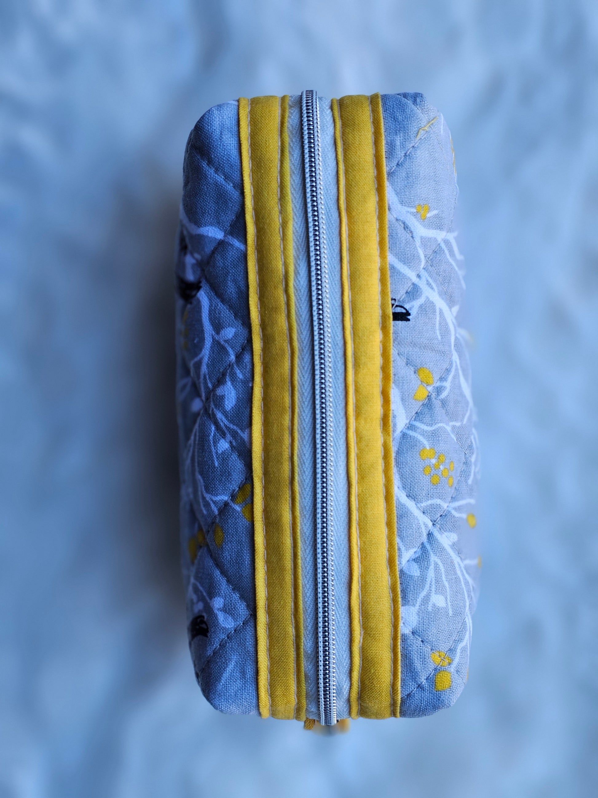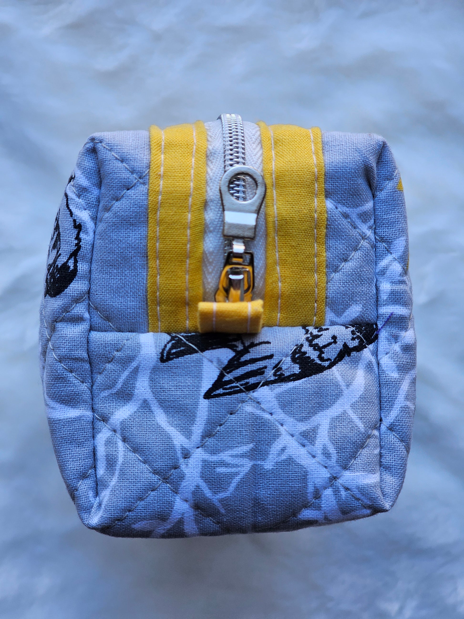 Grey Branch Sparrow Bird Pattern Yellow Accented Quilted Pattern Mini Zipper Box Pouch