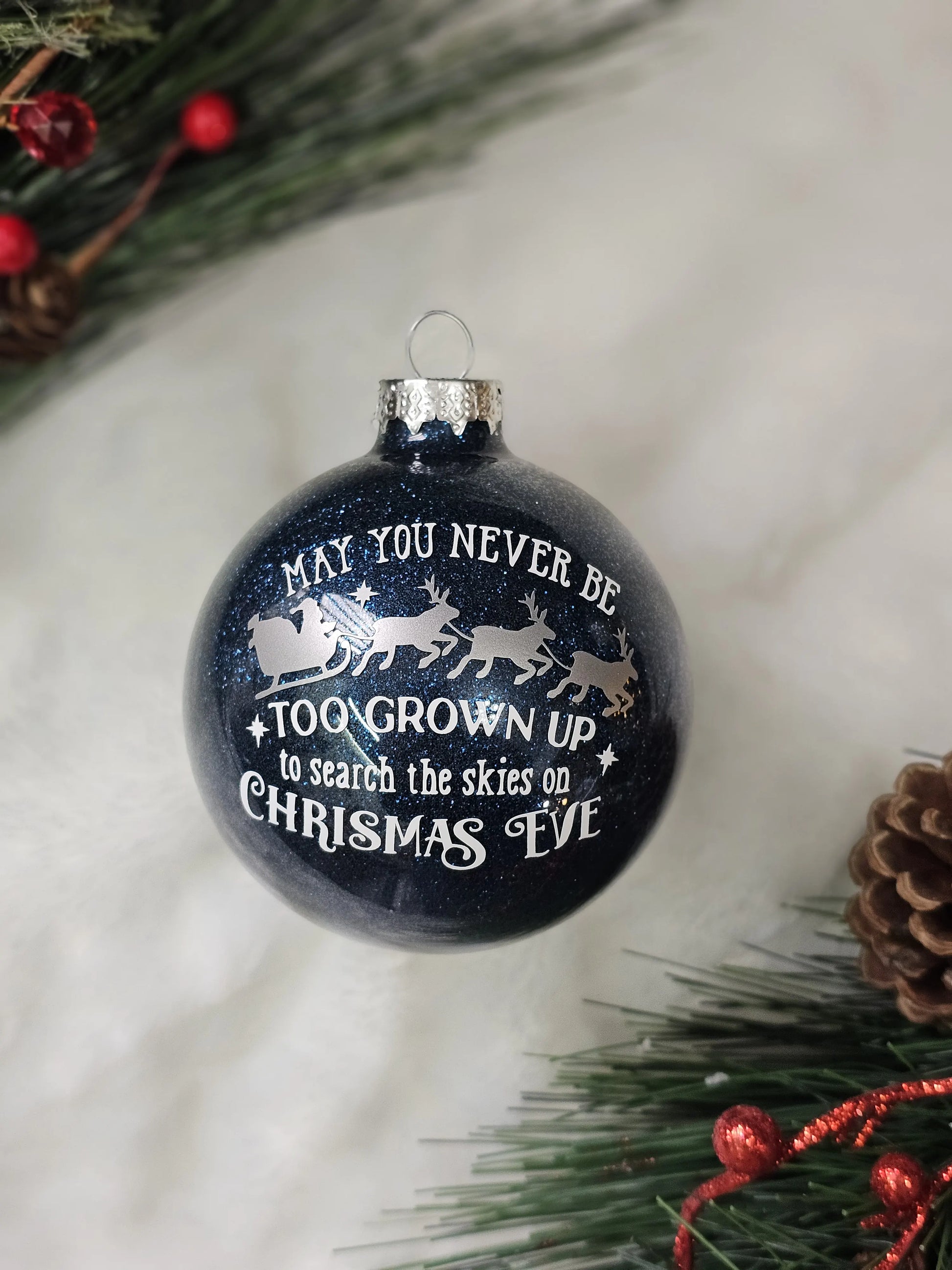 This "May You Never Be Too Grown Up Christmas" Ornament is designed to bring joy and nostalgia to your festive celebrations. Featuring Santa and his reindeer, this ornament will make a wonderful addition to your holiday decorations and serve as a reminder that everyone deserves to remain young at heart.