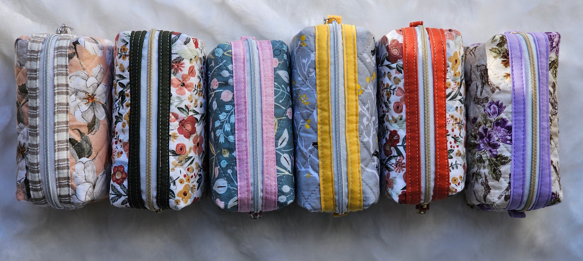 We hand cut fabric for each pouch. Fabric is cut to size, and then sewn in pattern and size for our pouches. Metal hardware is then attached.