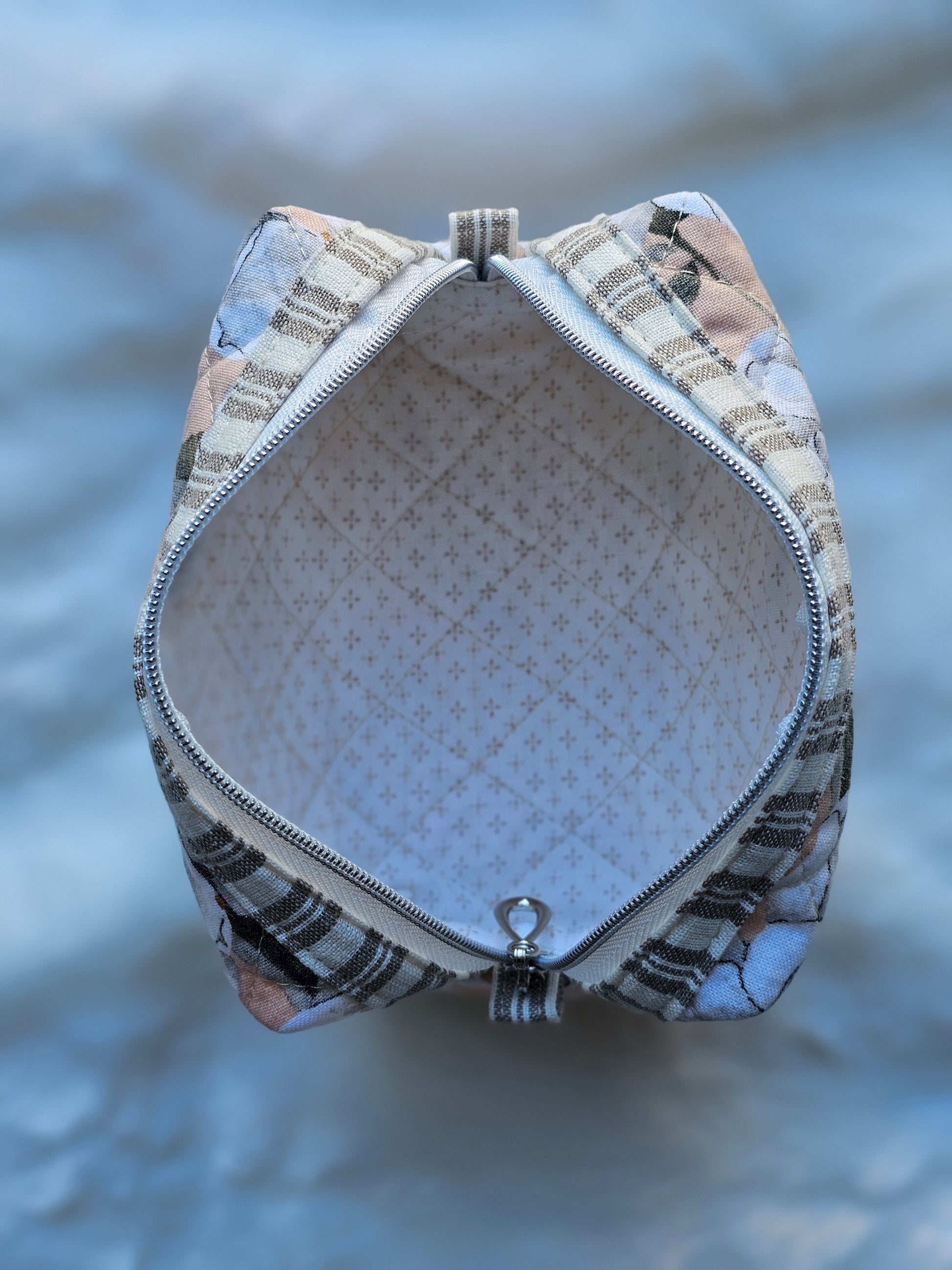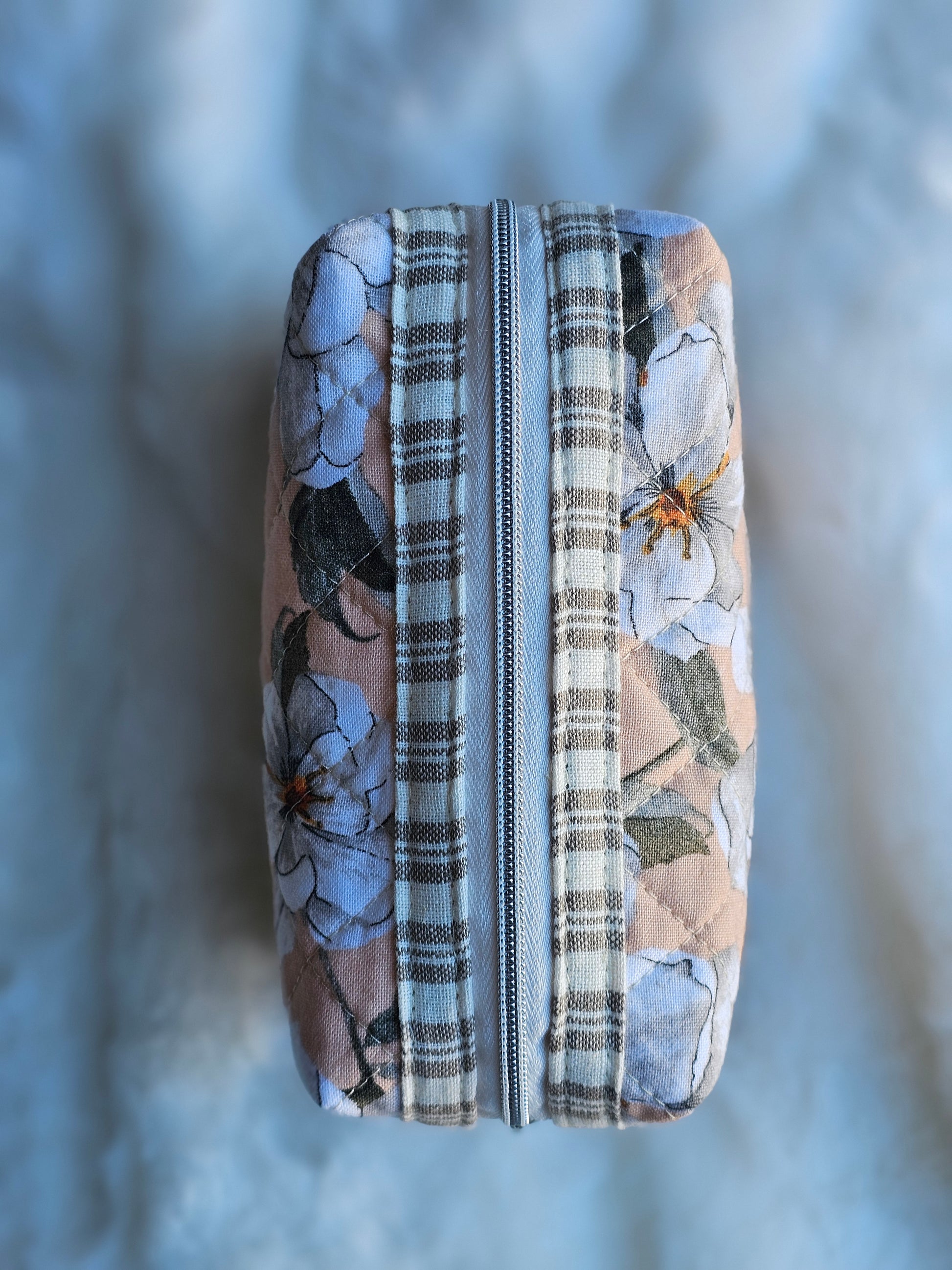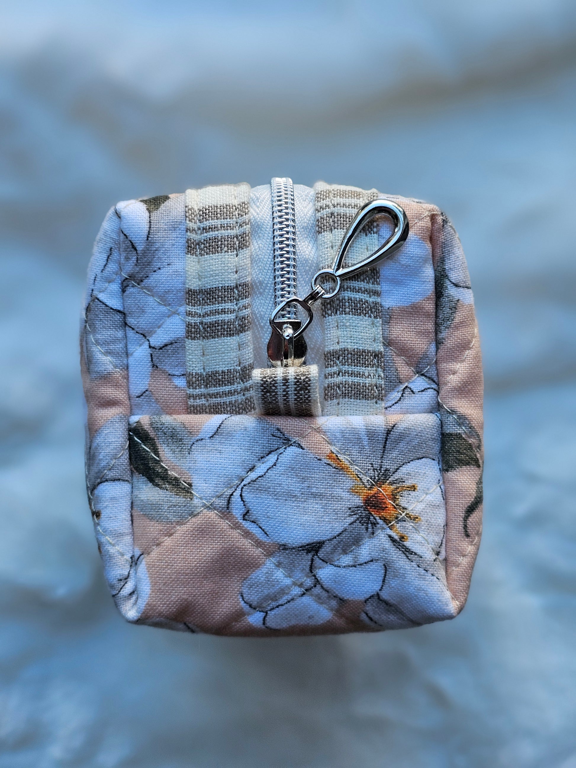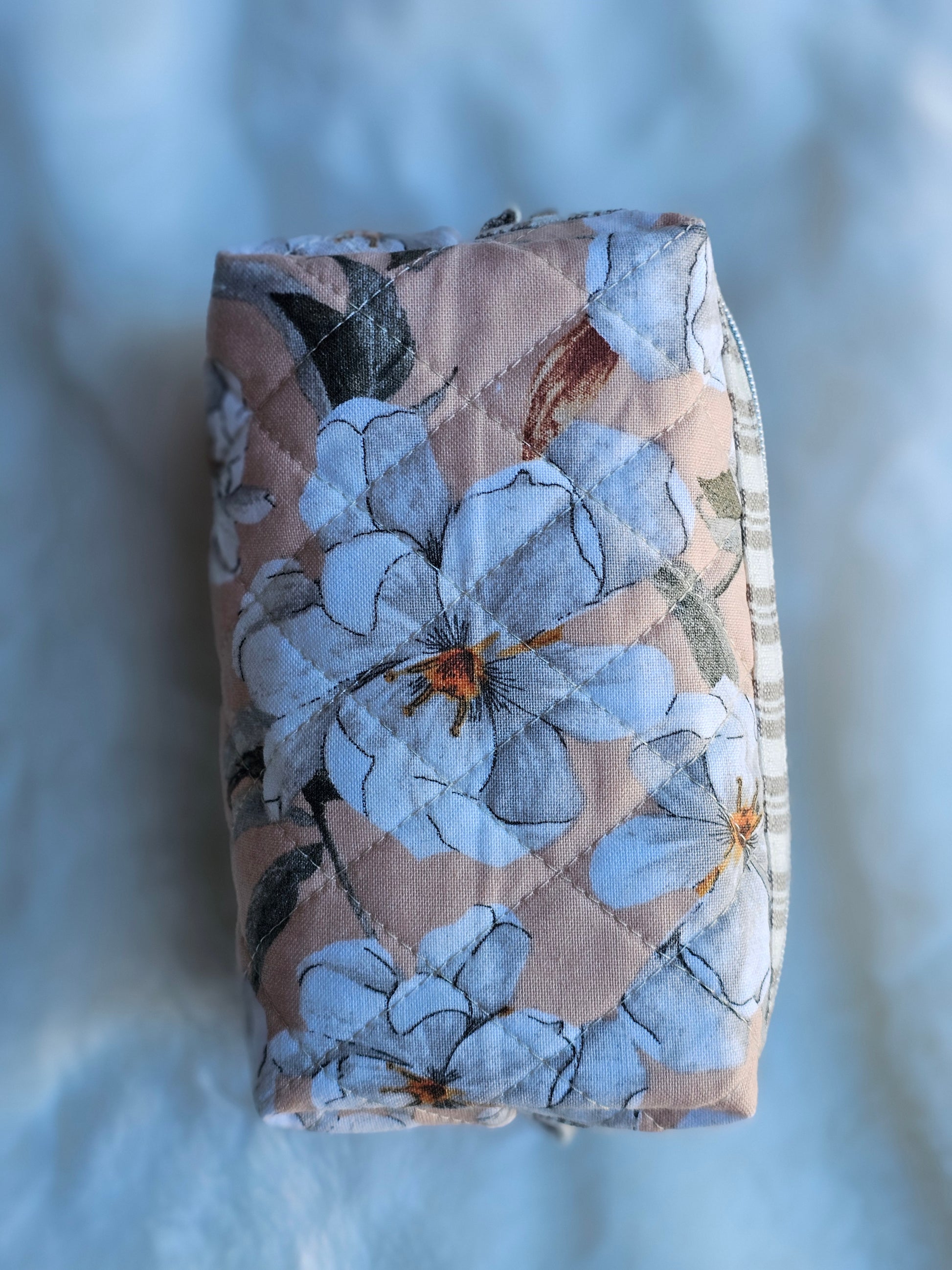 Enhance your everyday essentials with this peach-colored quilted mini zipper pouch, adorned with an elegant white Magnolia flower pattern and striped accents. Perfect for makeup or cosmetic storage, its compact design and reliable zipper ensure your items stay organized and within reach. Bring both style and functionality to your collection with this charming, handmade pouch.