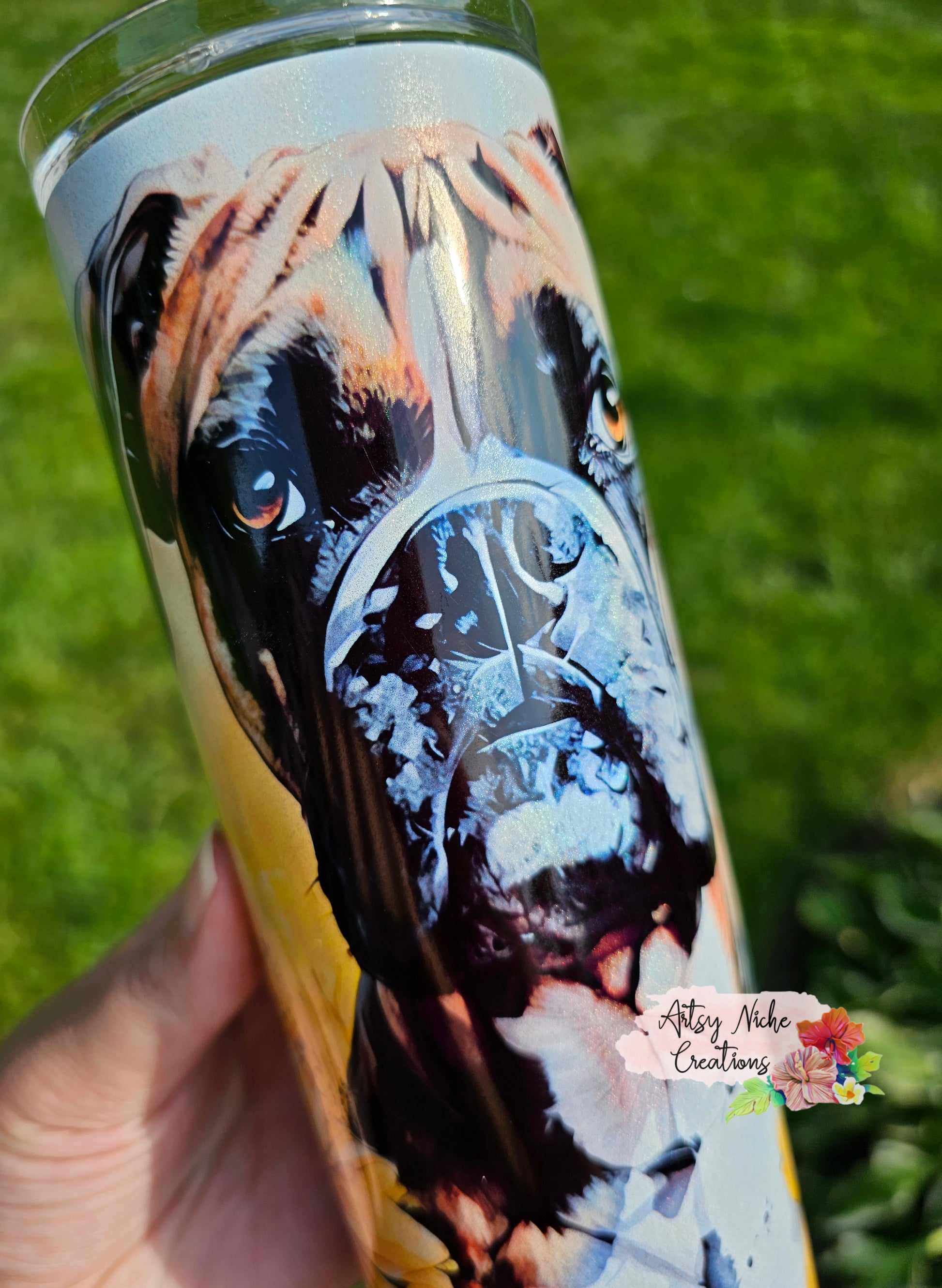 Grab your 20 oz Holographic Boxer Dog Flowers Sublimation Tumbler and come along for the ride! This awesome tumbler has a pup-tacular holographic Boxer dog coupled with yellow/gold flowers--doggone it if it isn't too cute! Refreshingly lightweight and featuring sublimation tumbler technology; you'll be hydrated in style!