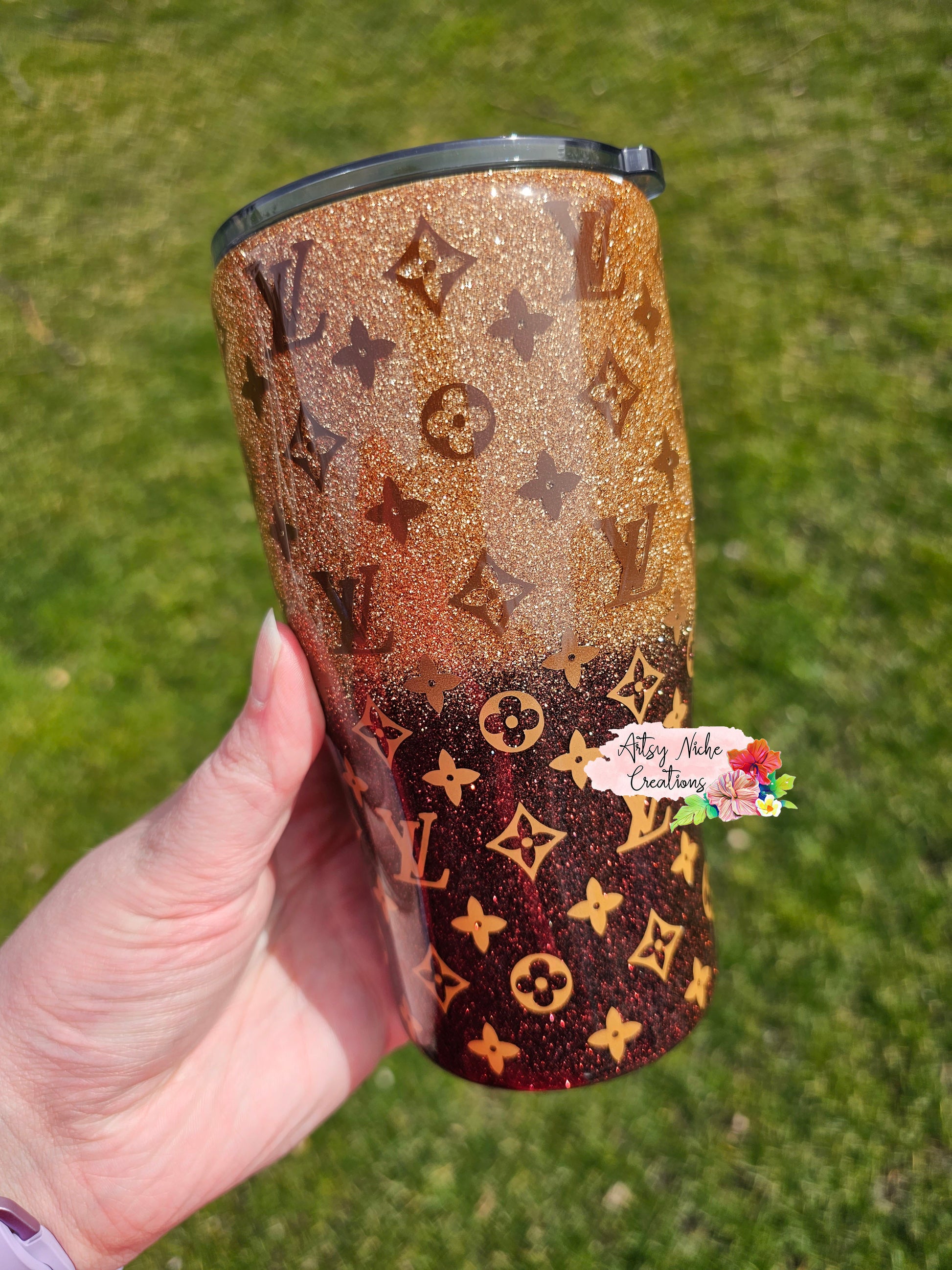 This exquisite 20 oz tumbler combines the elegant refinement of the Louis Vuitton brand with a modernized, curved design. An ombre glitter, offers a mesmerizing form of visual appeal, while the luxurious epoxy coating provides a tactile and pleasant sensation. Enjoy the elevated status of carrying a finely crafted piece.