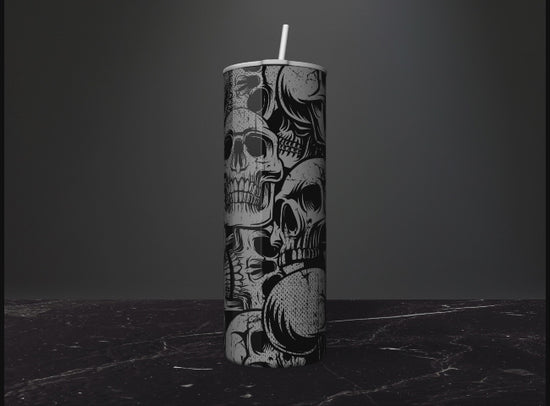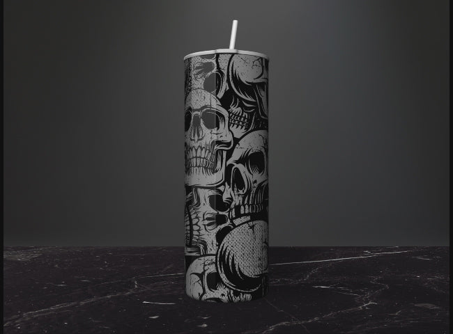 Take risk and step up your drink game with a 20 oz Skinny Grey Skulls Sublimation Tumbler. Featuring a bold skull pattern, this tumbler dares you to go beyond the ordinary and level up your daily style. Dare to make a statement with this accessory.