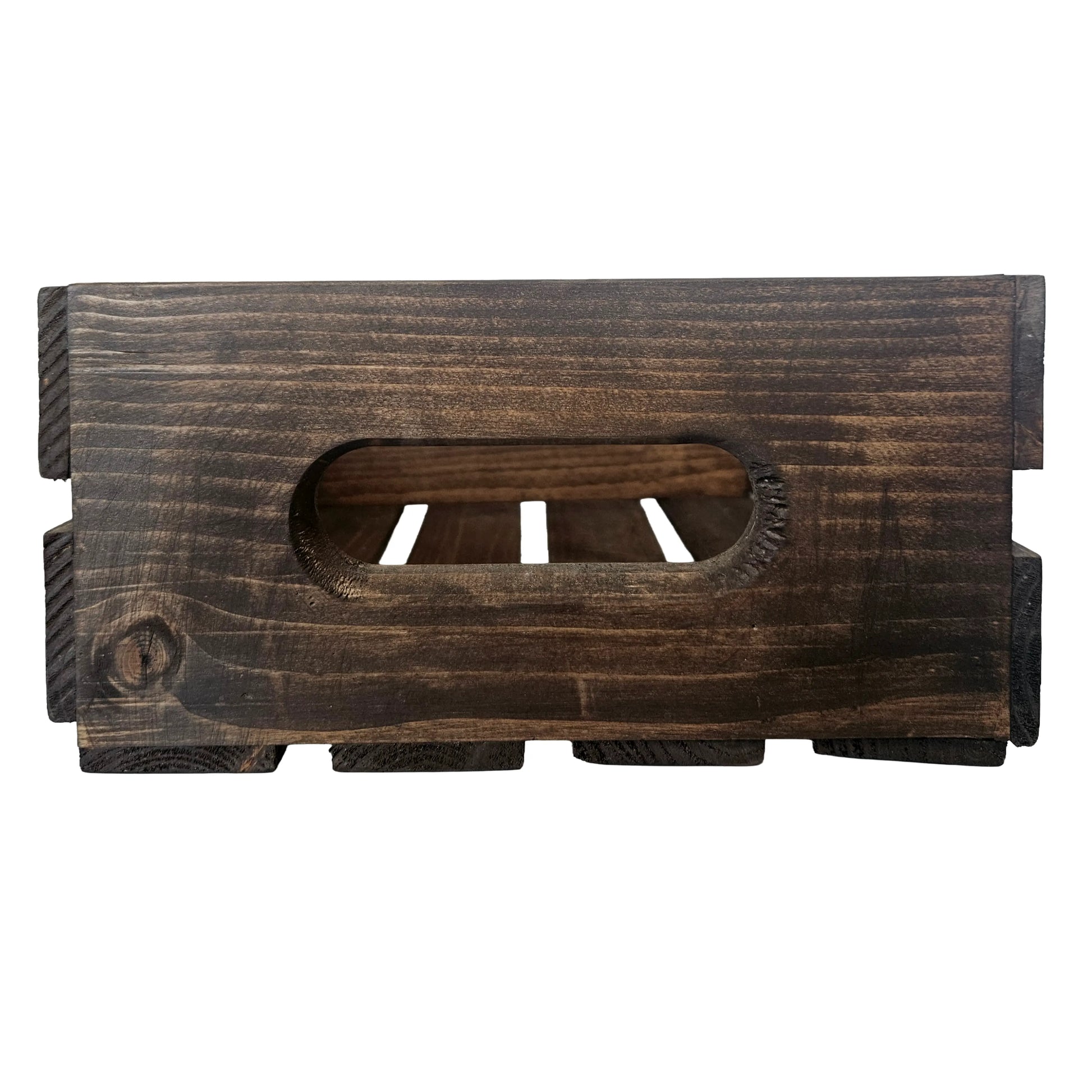This handcrafted solid wood crate features intricate wood-burnt designs showcasing reindeer and delicate snowflake patterns. Finished in a rich special walnut stain that enhances the natural grain, it combines rustic charm with seasonal elegance. Sturdy side handles make it perfect for storage, display, or gifting. An ideal accent piece for holiday décor that brings warmth and artisanal character to any space.