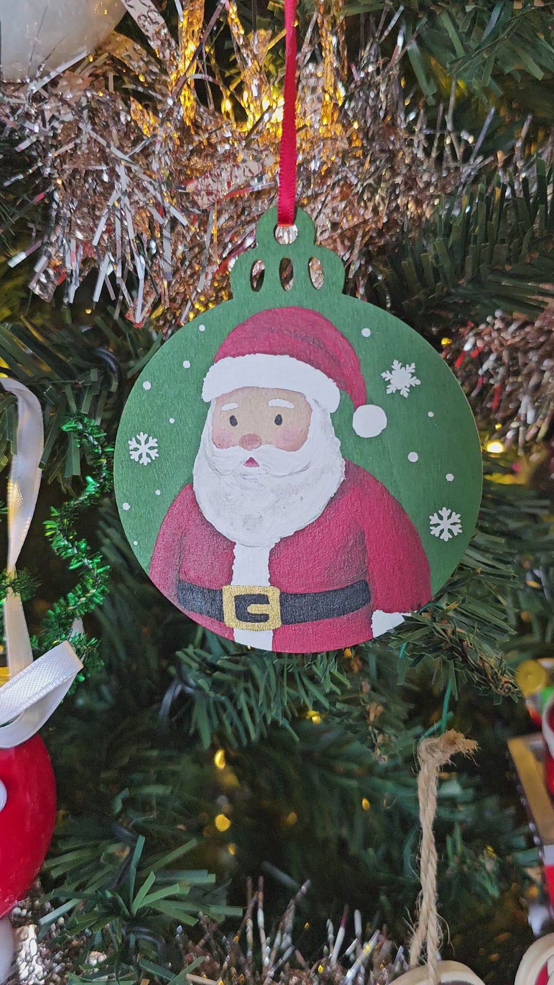 Green Santa Claus Snowfall Handpainted Wooden Christmas Ornament
