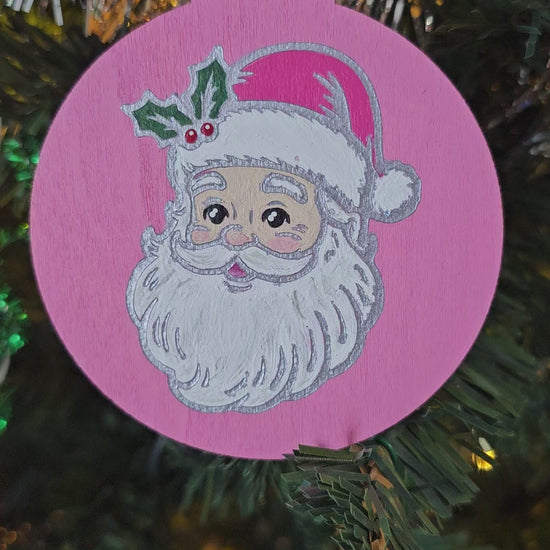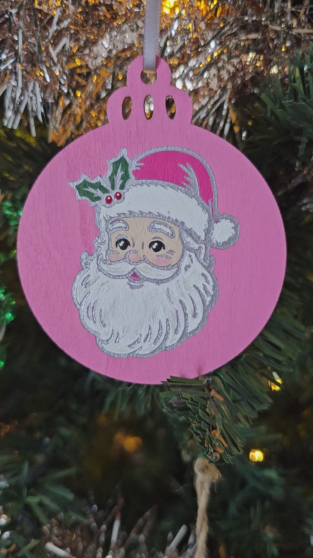 Pink Santa Portrait Handpainted Wooden Christmas Ornament