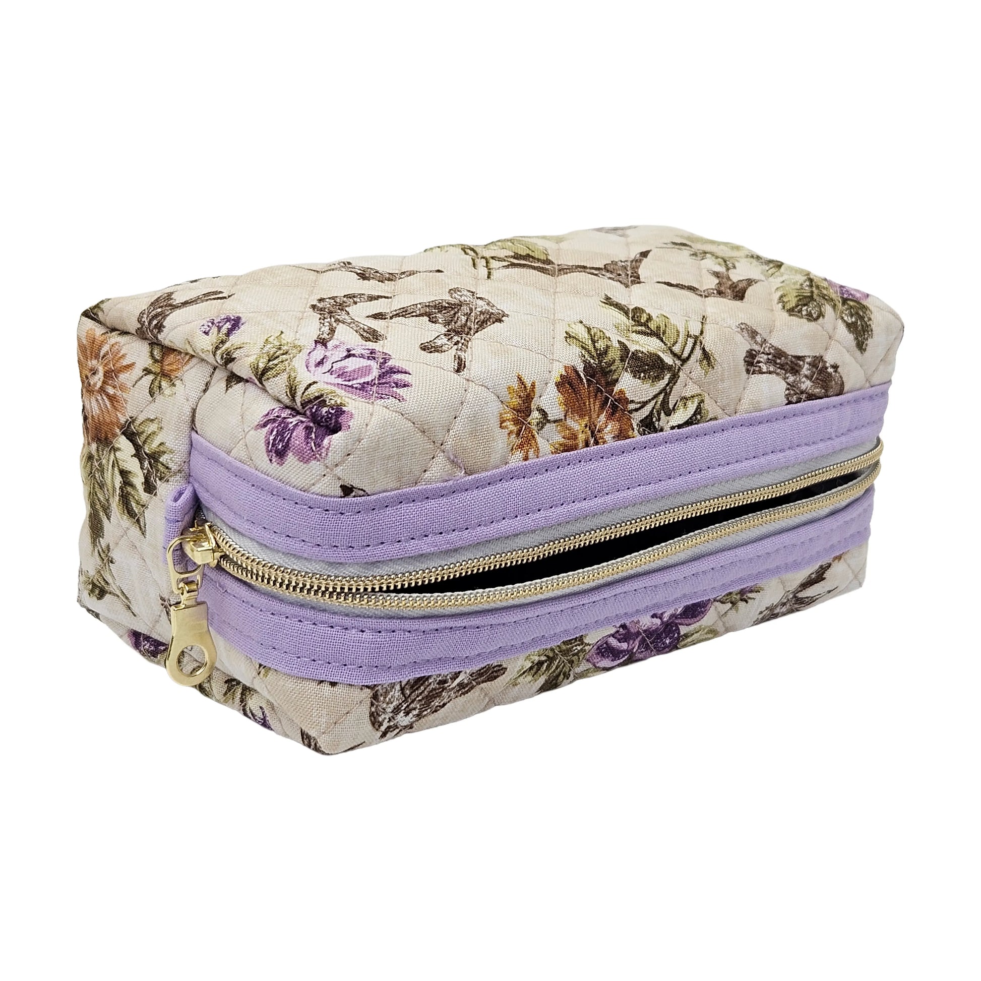Elevate your daily routine with this quilted mini zipper pouch, featuring a stunning purple floral design accented by graceful finch birds. Ideal for storing makeup or cosmetics, its compact size and secure zipper keep your essentials organized and easily accessible. Add a touch of charm and practicality to your collection with this beautifully crafted pouch.